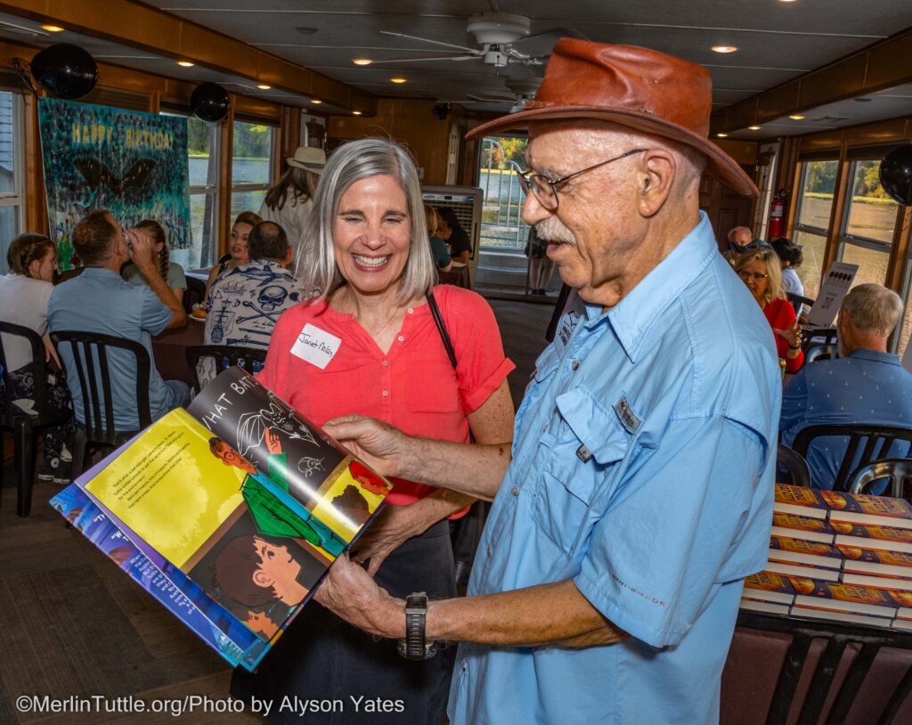 Author, Janet Nolan, showing her book 'Bats Beneath the Bridge' to Merlin during our Merlin Tuttle Day cruise.